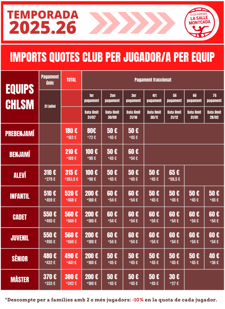 • Quota inscripció jugador al club 2025-2026 -Quota inscripció equip a Real Federación Española de Balonmano, Federació Catalana d’Handbol o Consell Escolar.